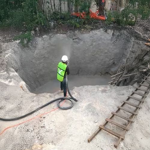 El rendimiento de referencia (300–600 m² por jornada de 8 h) depende de apertura del terreno, logística de mezcla de materiales, el clima y especificación de acabado